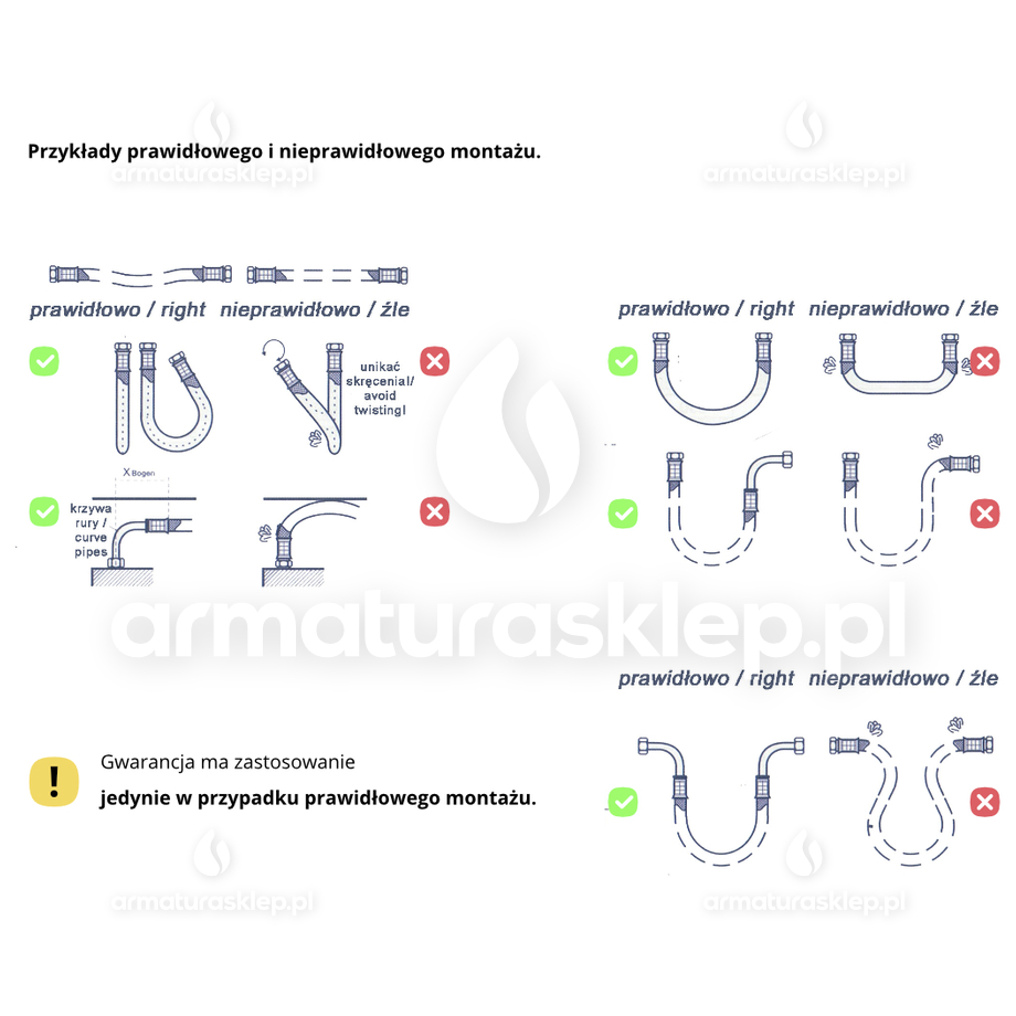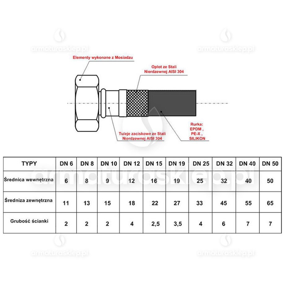 Wężyki wykonane są z najwyższej jakości materiałów pochodzących z EUROPY i POLSKI. Osiągnięto to przez stosowanie oplotu ze stali nierdzewnej AISI 304 i gumy (EPDM) (z przeznaczeniem do wody pitnej).